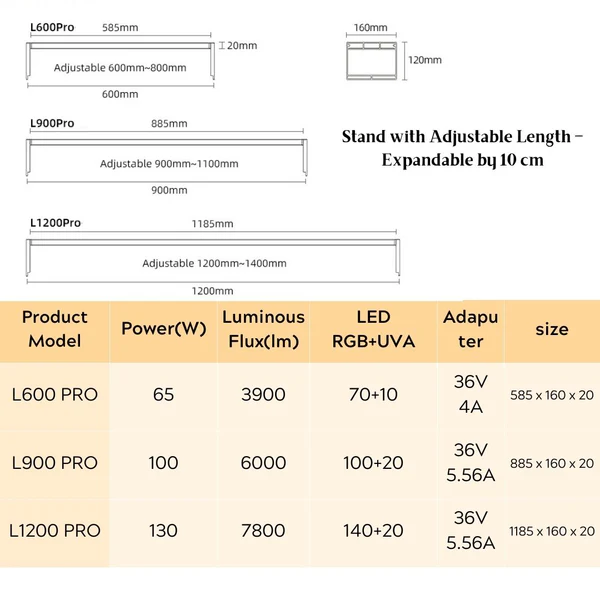 רגליות אלגנטיות ואיכותיות להנחת התאורה עשויות סגסוגת אלומיניום ניתנות לפתיחה של 10 ס"מ לכל רגלית (סה"כ 20 ס"מ), כמו כן, ניתן להשתמש בפתרונות קיבוע ותלייה נוספות מבית וויק אקווה.
