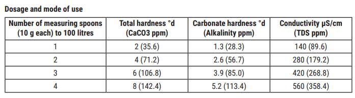 כדי להעלות קשיות ב 4 ° dKH, יש להמיס כף מדידה (10גרם) ב- 100 ליטר של מי אוסמוזה.